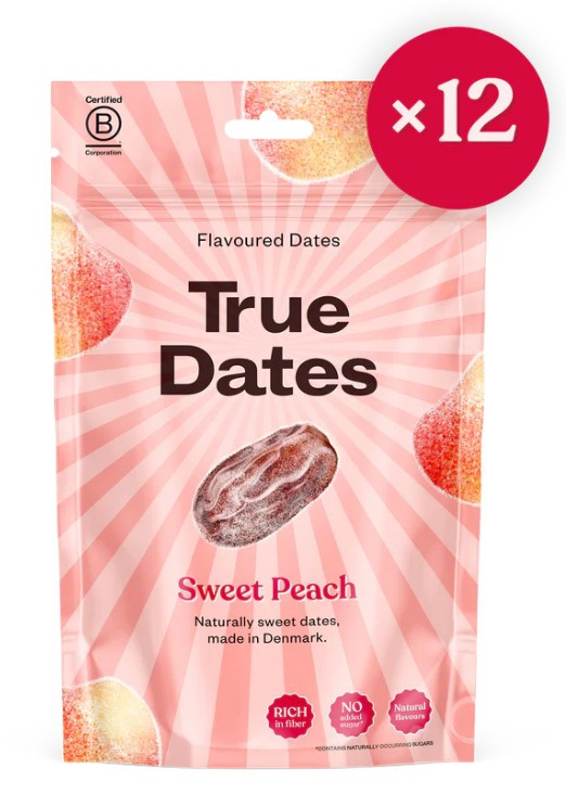 Magozott datolya őszibarack ízzel. Összetevők: Datolya (nem EU-s) (95%), cikóriagyökér rost, növényi zsír (kókusz), természetes aroma, sav (almasav). Nyomokban földimogyorót és mandulát tartalmazhat. Száraz, hűvös helyen tárolandó. Felbontás után 14 napon belül fogyasztható.